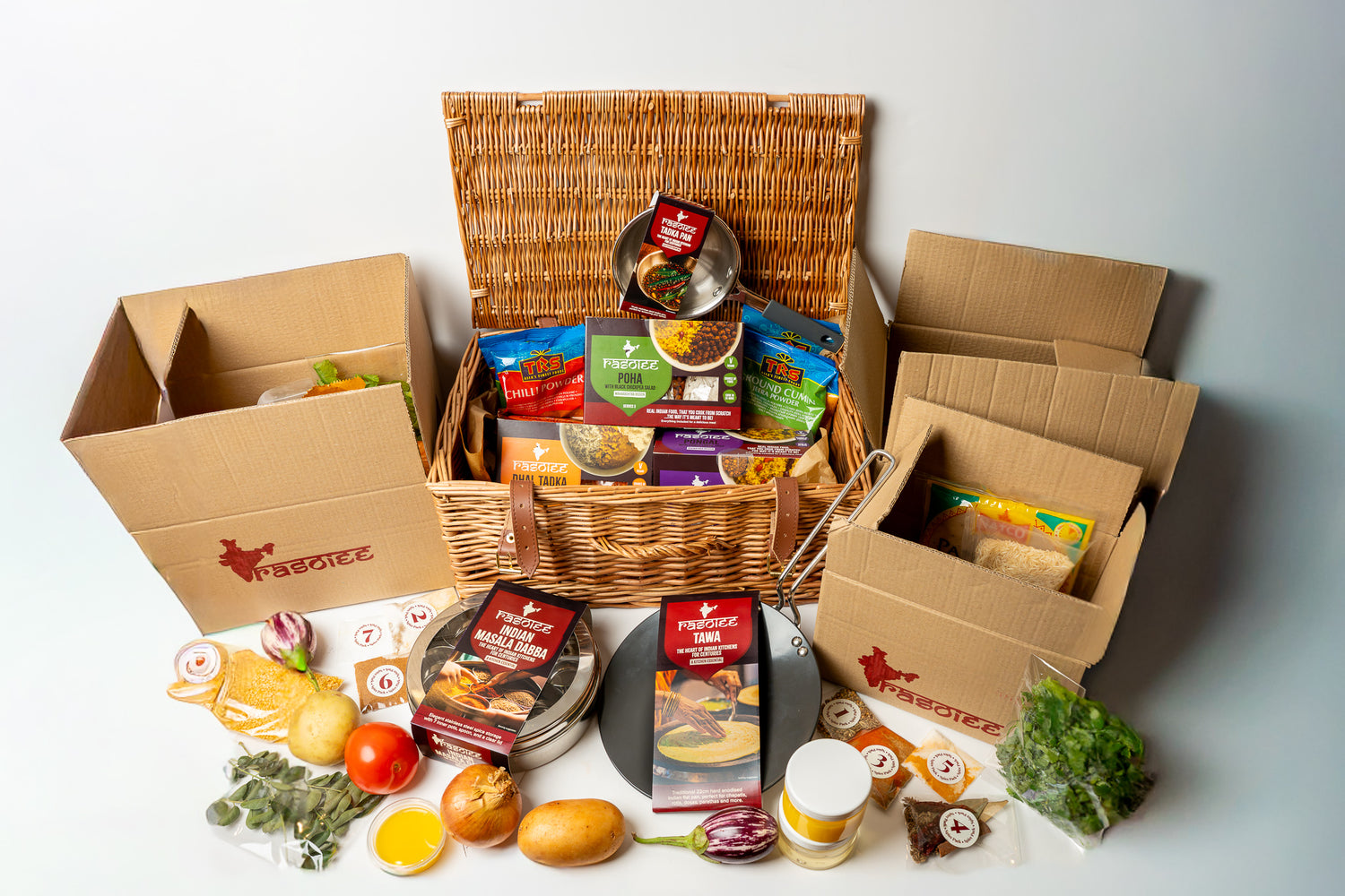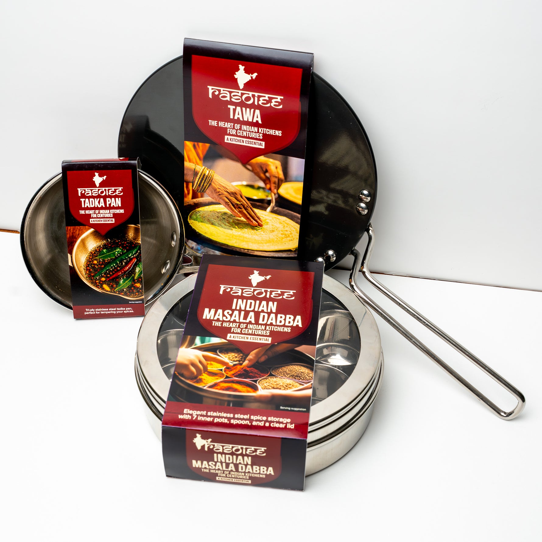 The kitchen essentials: tawa, tadka pan and masala dabba with spices