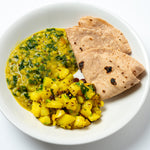 The hearty yellow moong daal is gently simmered with fresh spinach, garlic, and warming spices, then topped with a fragrant tempering for a soul-soothing dish. It’s perfectly complemented by soft flame-finished phulkas and tender baby potatoes tossed with mustard seeds, curry leaves, and a touch of lemon. Delicately spiced and subtly sweet with raisins and cashews, this nourishing trio brings together authentic flavours and satisfying textures in every bite.