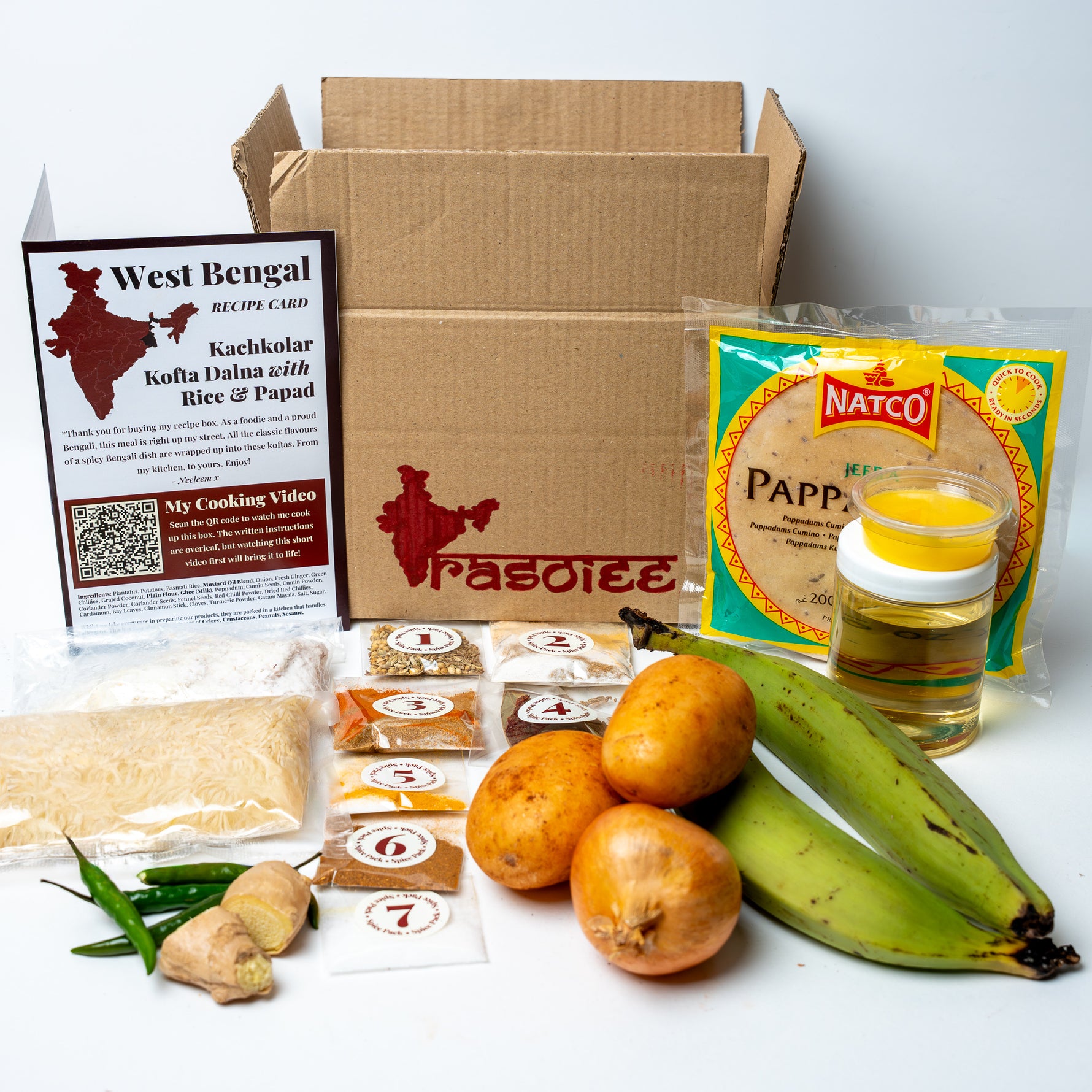 Each box is hand-packed with everything you need: raw, all-natural ingredients including spices, lentils, rice, flour, oil, and temp-controlled dairy and fresh produce. No pre-made pastes, no preservatives, just real food. Every recipe is sourced from a family kitchen, and comes with a step-by-step recipe card and a QR code to watch the home chef cook the dish alongside you.