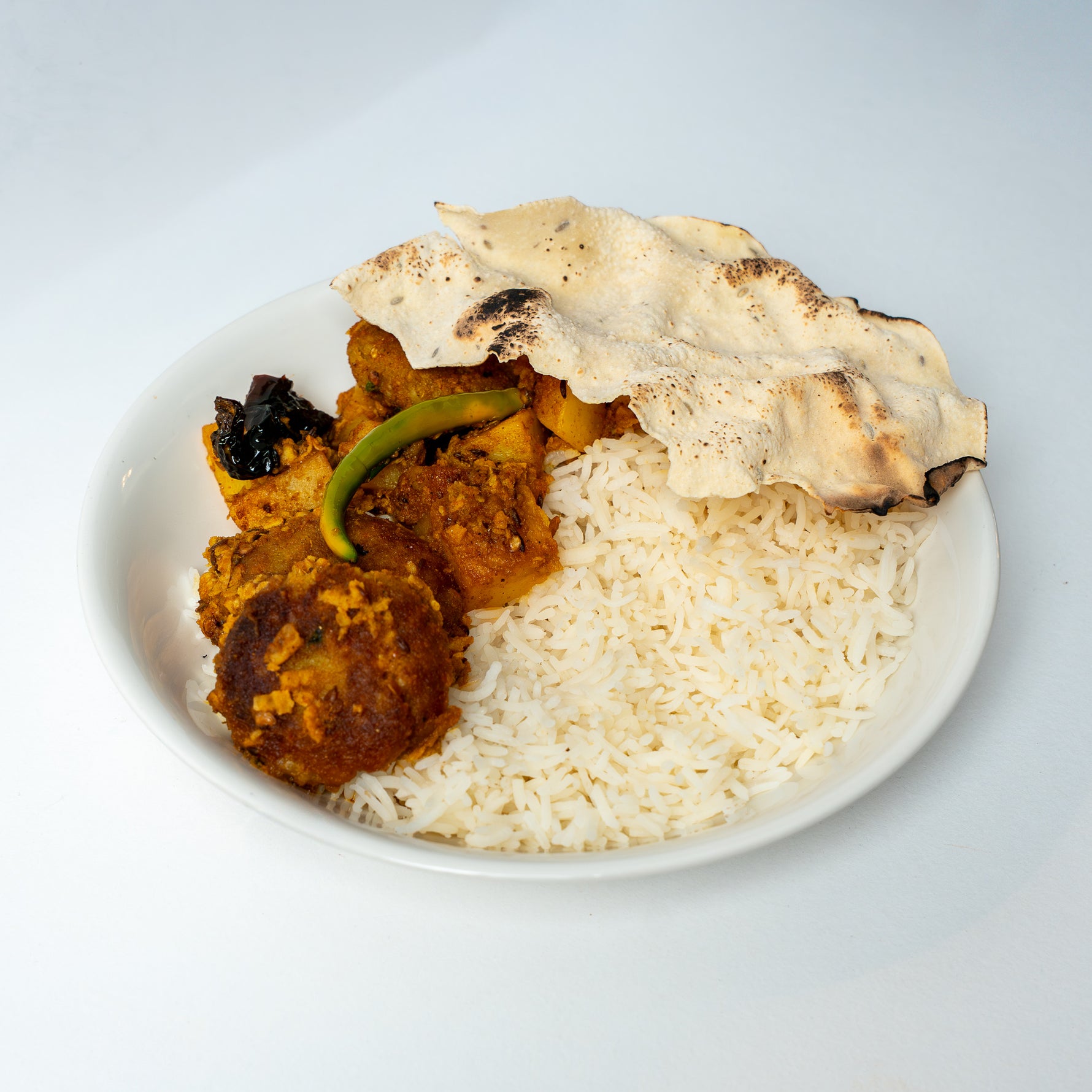 A beloved Bengali comfort dish features golden plantain and potato koftas simmered in a fragrant, spiced gravy. Paired with fluffy basmati rice and crisp poppadum this spicy meal brings bold flavour and rich tradition straight to your plate. Note, this is perhaps one for more confident cooks, looking to expand their culinary repertoire!