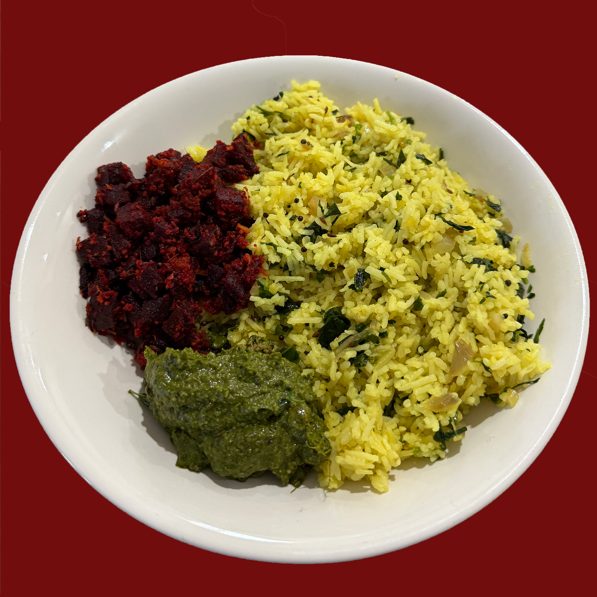 Bright, bold, and nourishing, this meal is a celebration of colour and flavour. Fragrant basmati rice is cooked with fresh fenugreek leaves, green chillies, and caramelised onions for a beautifully earthy, aromatic base. On the side, a punchy beetroot salad brings a vibrant contrast, lightly sautéed with garlic for depth and sweetness. A smooth, spiced spinach chutney rounds out the dish with tangy tamarind, nutty sesame, and a subtle kick of chilli.