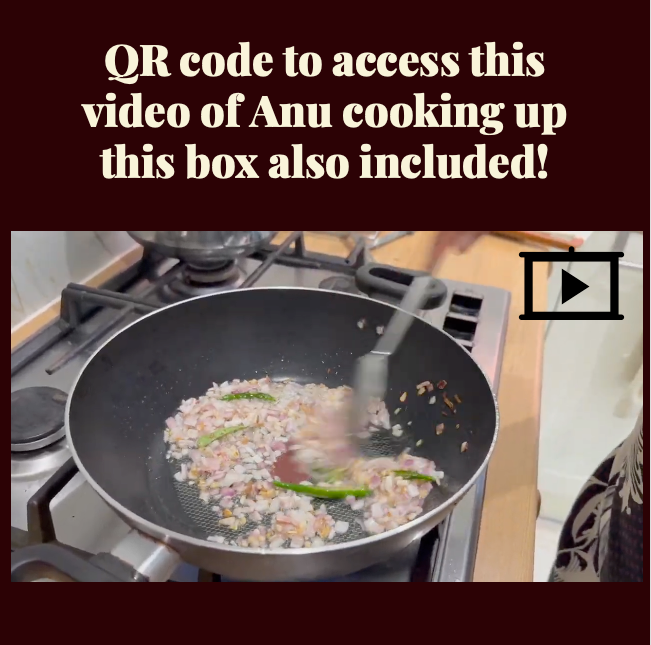 Our meal kits are your passport to cooking authentic Indian meals at home - with no shortcuts and no processed ingredients. Each box is packed with everything you need: raw, all-natural ingredients including spices, lentils, rice, flour, oil, and temp-controlled dairy and fresh produce. No pre-made pastes, no preservatives, just real food. Every recipe is sourced from a family kitchen, and comes with a step-by-step recipe card and a QR code to watch the home chef cook the dish alongside you.