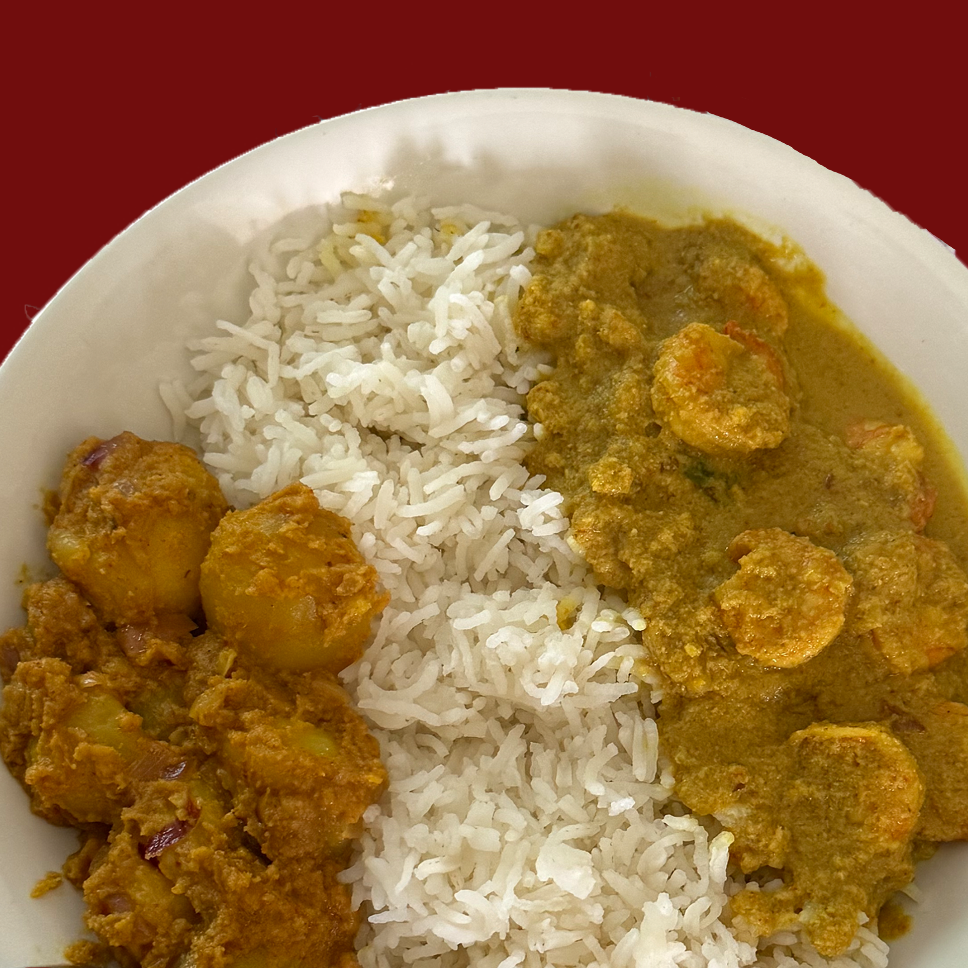 Juicy prawns are simmered in a rich coconut and tamarind gravy, spiced with red chillies, ginger, and green chillies for a fiery, tangy kick. Alongside, enjoy Batata Song — a traditional Goan-style potato sabji cooked with onions, garlic, tamarind, and roasted spices, all brought together with aromatic coconut oil. Served with fluffy basmati rice, this vibrant meal delivers a deeply satisfying and authentic taste of India’s western coast.